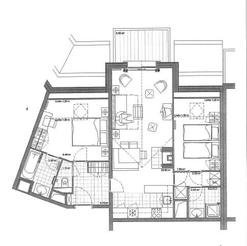 This charming and well laid out two bedroom/two bathroom apartment has 61.09 m2 of habitable living space and can comfortably sleep 6 people due to the pull out sofa bed in the living room.The apartment benefits a modern fully fitted kitchen, connected to the open planned dining/living area. From the living room you can access the fantastic 18.91m2 West facing balcony. The master bedroom has its own en-suite bathroom with WC and bath for unwinding after a hard days skiing. The second bedroom, a twin, has access to a separate shower room and WC.