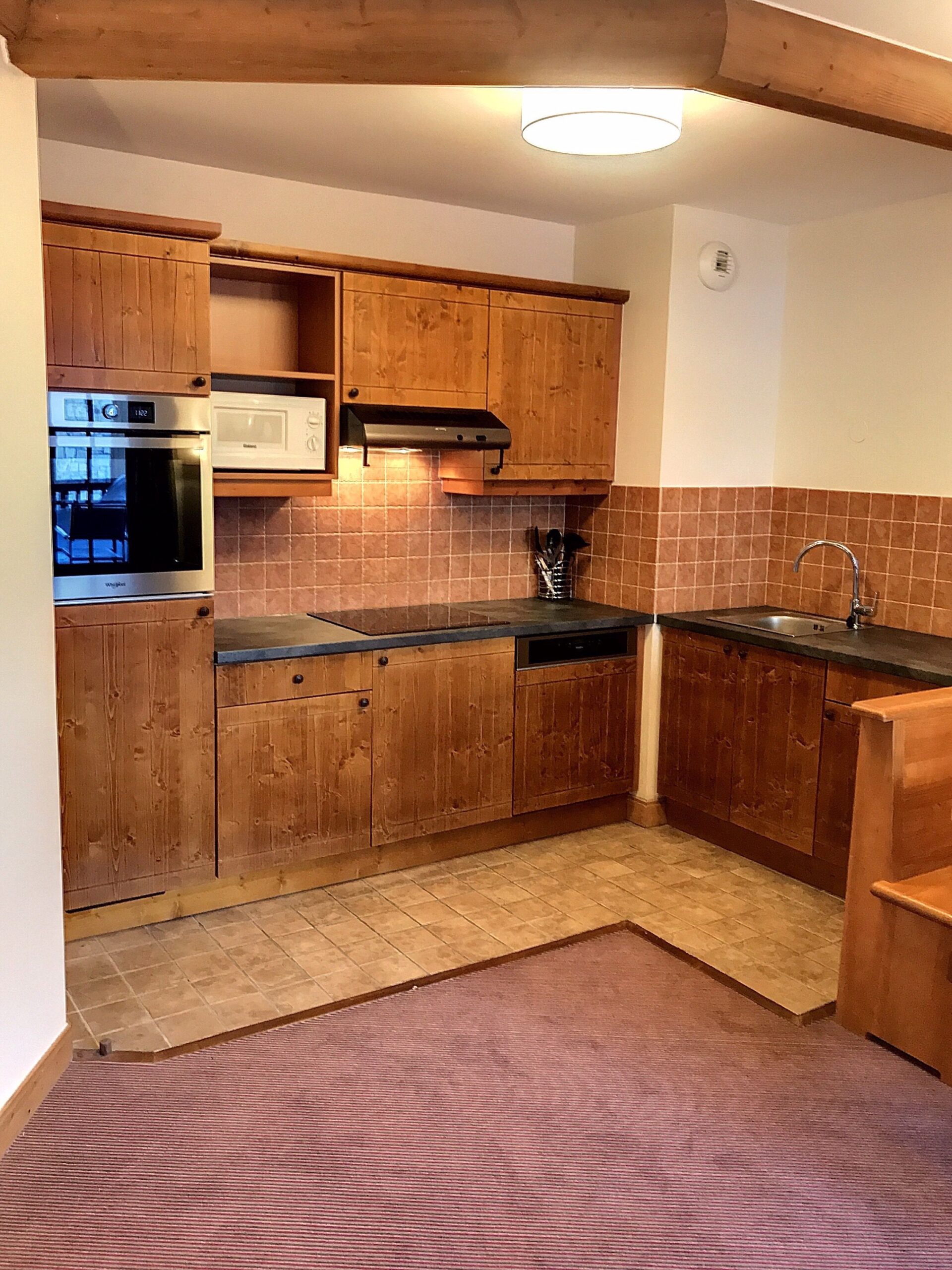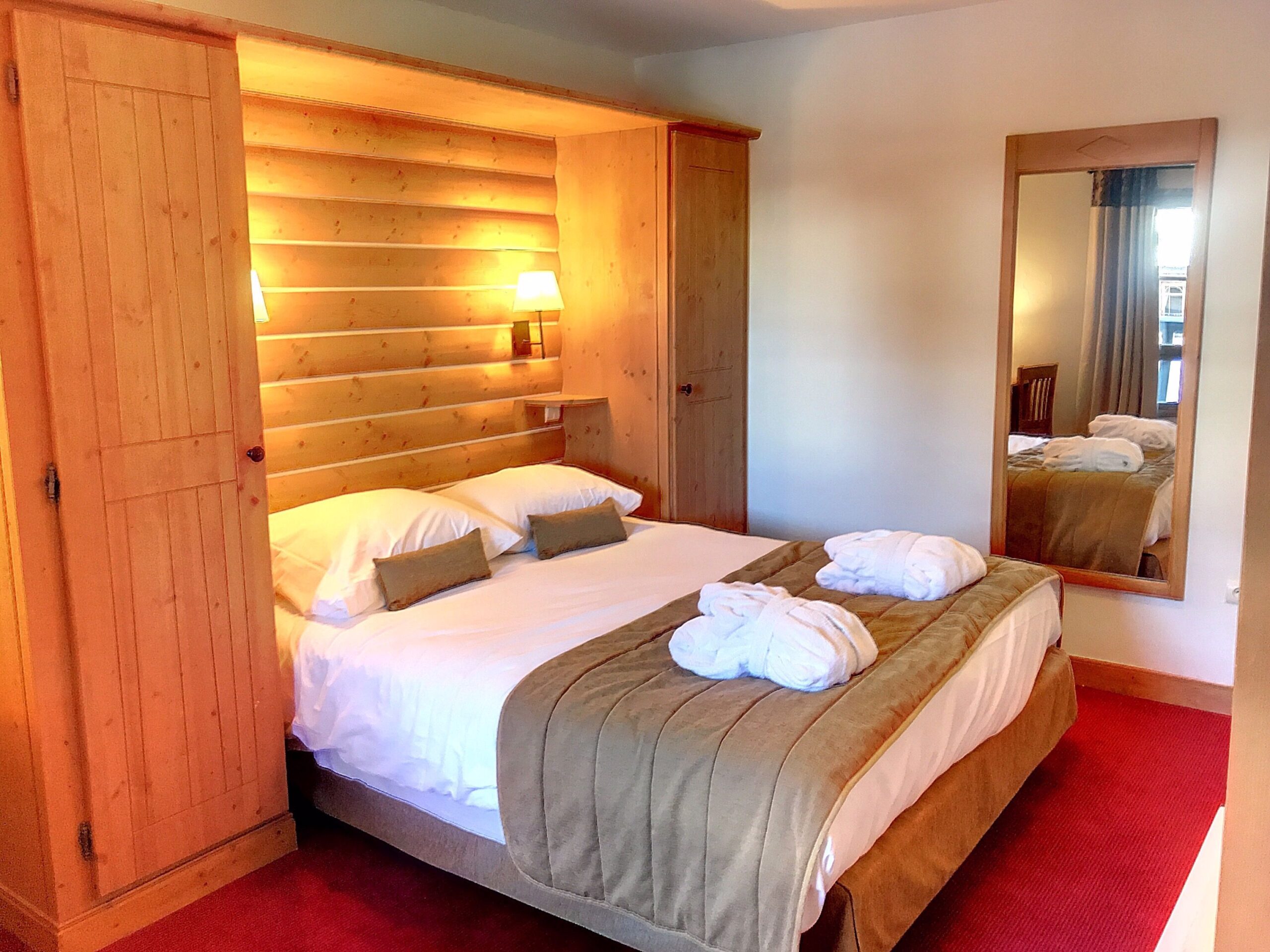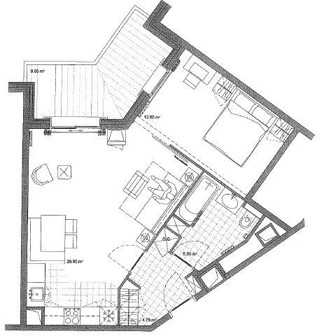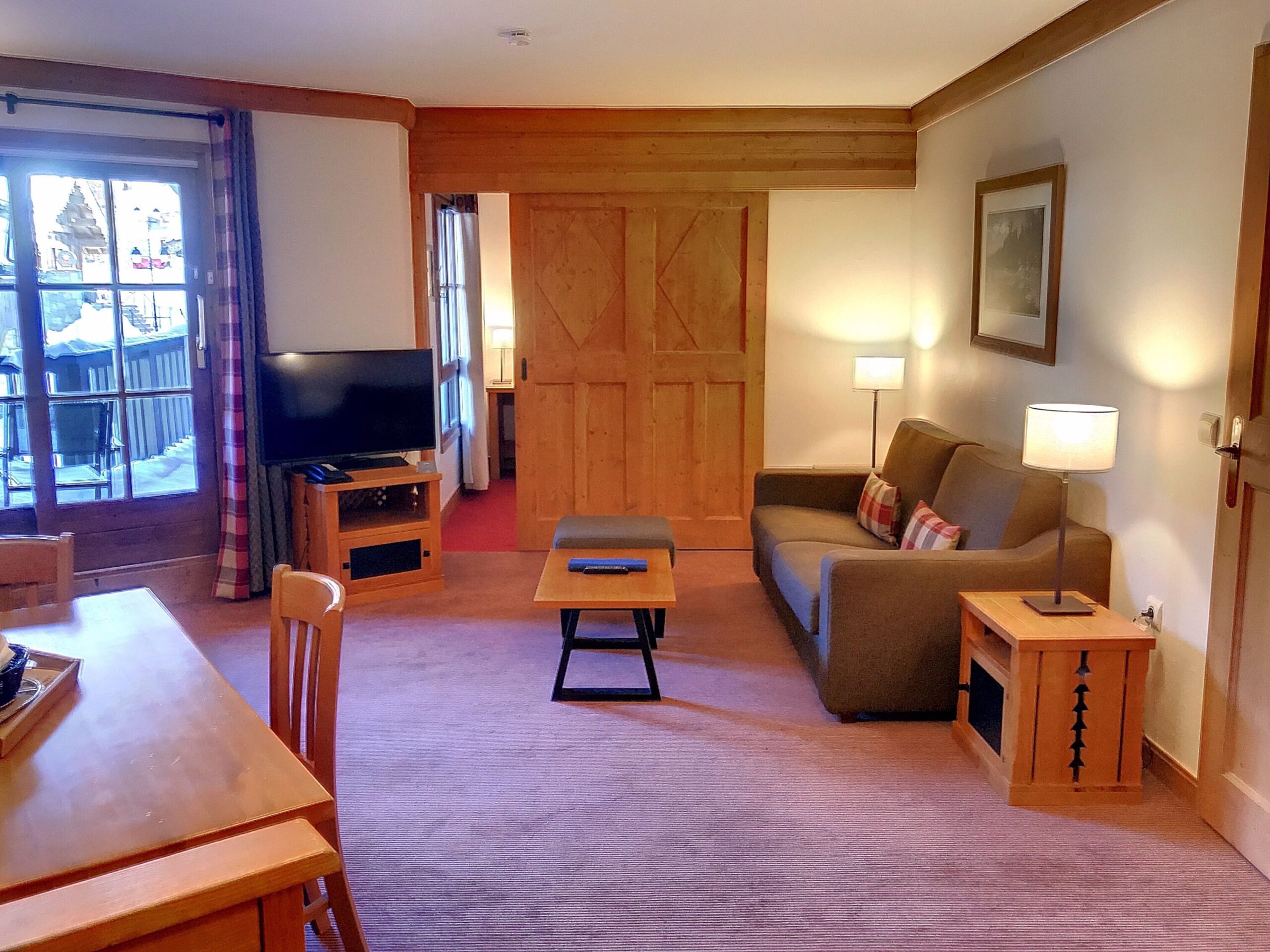 This large and well laid out one bedroom apartment has 49.80m2 of habitable living space and can comfortably sleep 4 people due to the pull out sofa in the living room. The apartment benefits from a modern fully fitted kitchen, connected to the open planned dining/living area. From the living room you can access the 8.95m2 North-East facing balcony. There is one master bedroom and a separate bathroom and WC.The apartments in Auberge Jérôme benefit from the use of a heated outdoor pool and Jacuzzi, as well as a gym, sauna and steam room. There is also cable TV and free internet access, as well as an owner’s store cupboard within the apartment. Each apartment has an extra storage ‘cave’ in the basement and a ski locker in the boot room. Auberge Jérôme has free allocated parking in the underground car park.