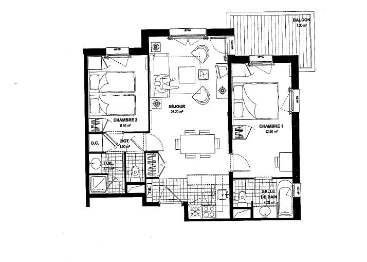 This charming 2 bedroom apartment is located in Manoir Savoie and has a habitable living area of 57m2. The apartment entrance leads into the modern kitchen, connected to the spacious reception room, which has a pull-out sofa allowing the apartment to sleep 6 in comfort. There is a master bedroom with an en-suite bathroom and a twin room with a separate shower room and WC. The apartment also benefits a lovely East facing 7.3m2 balcony.