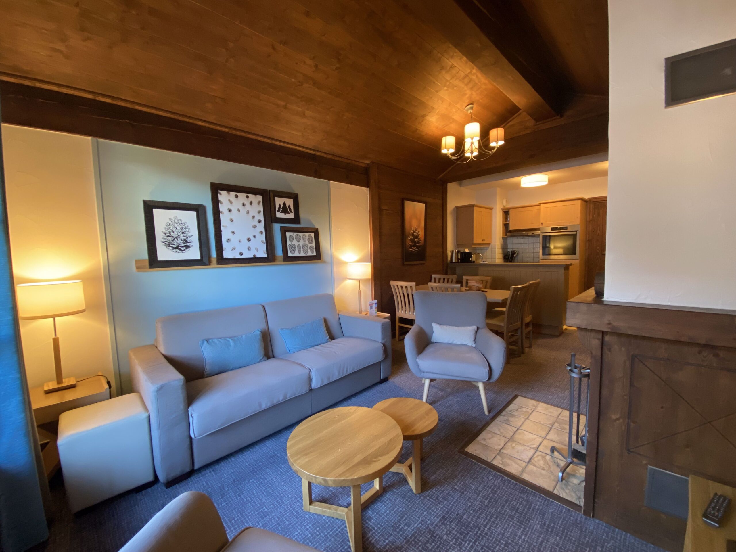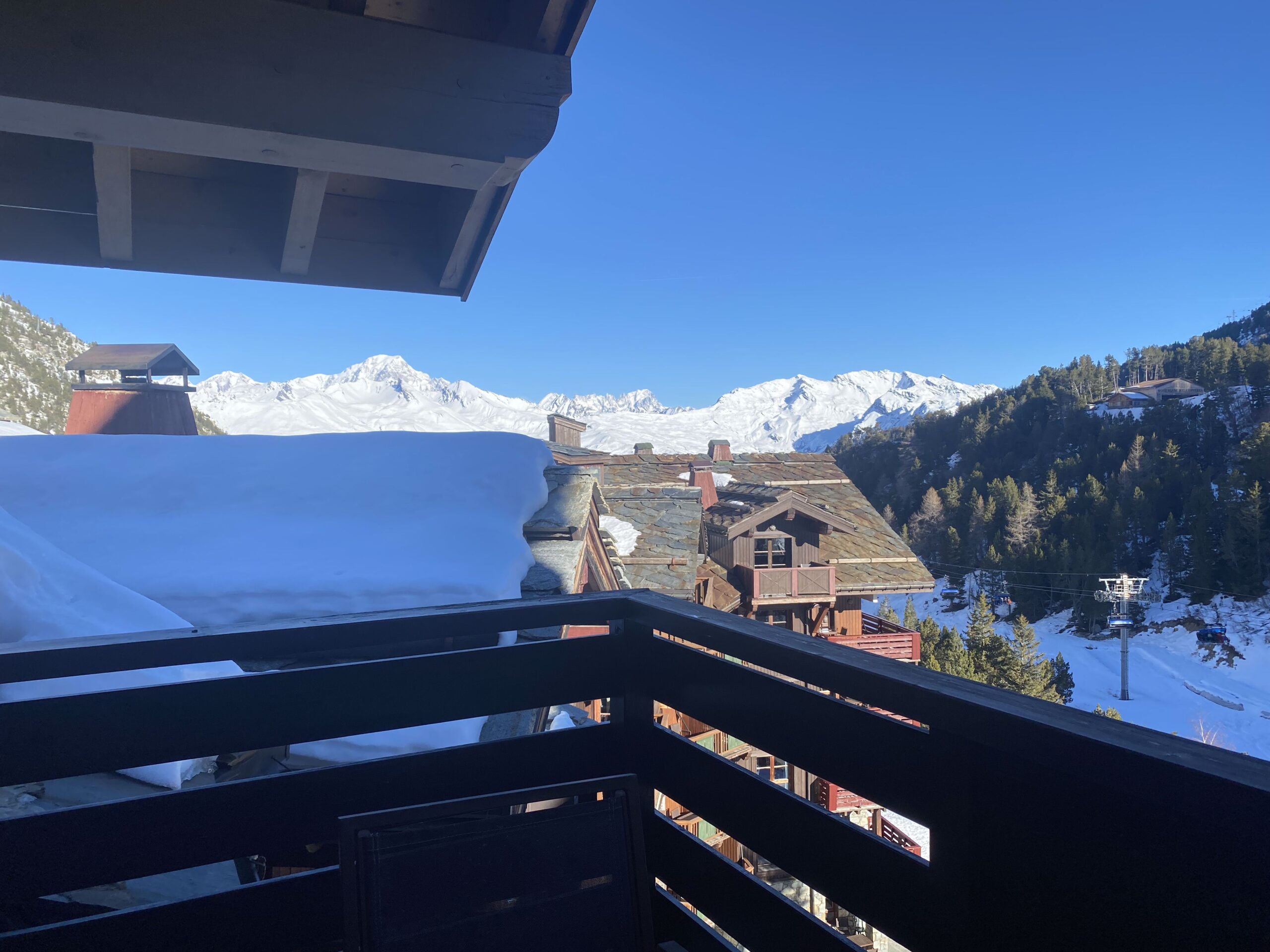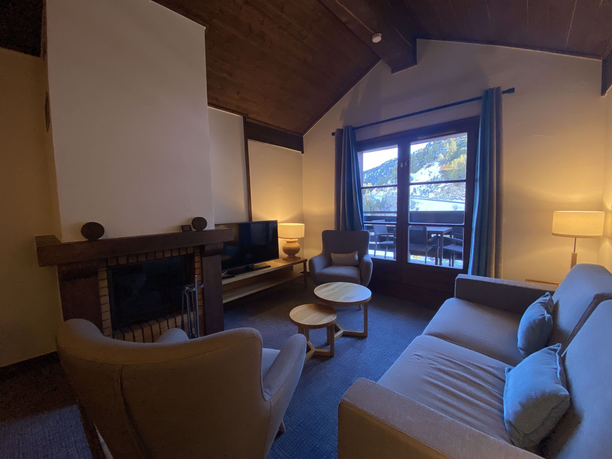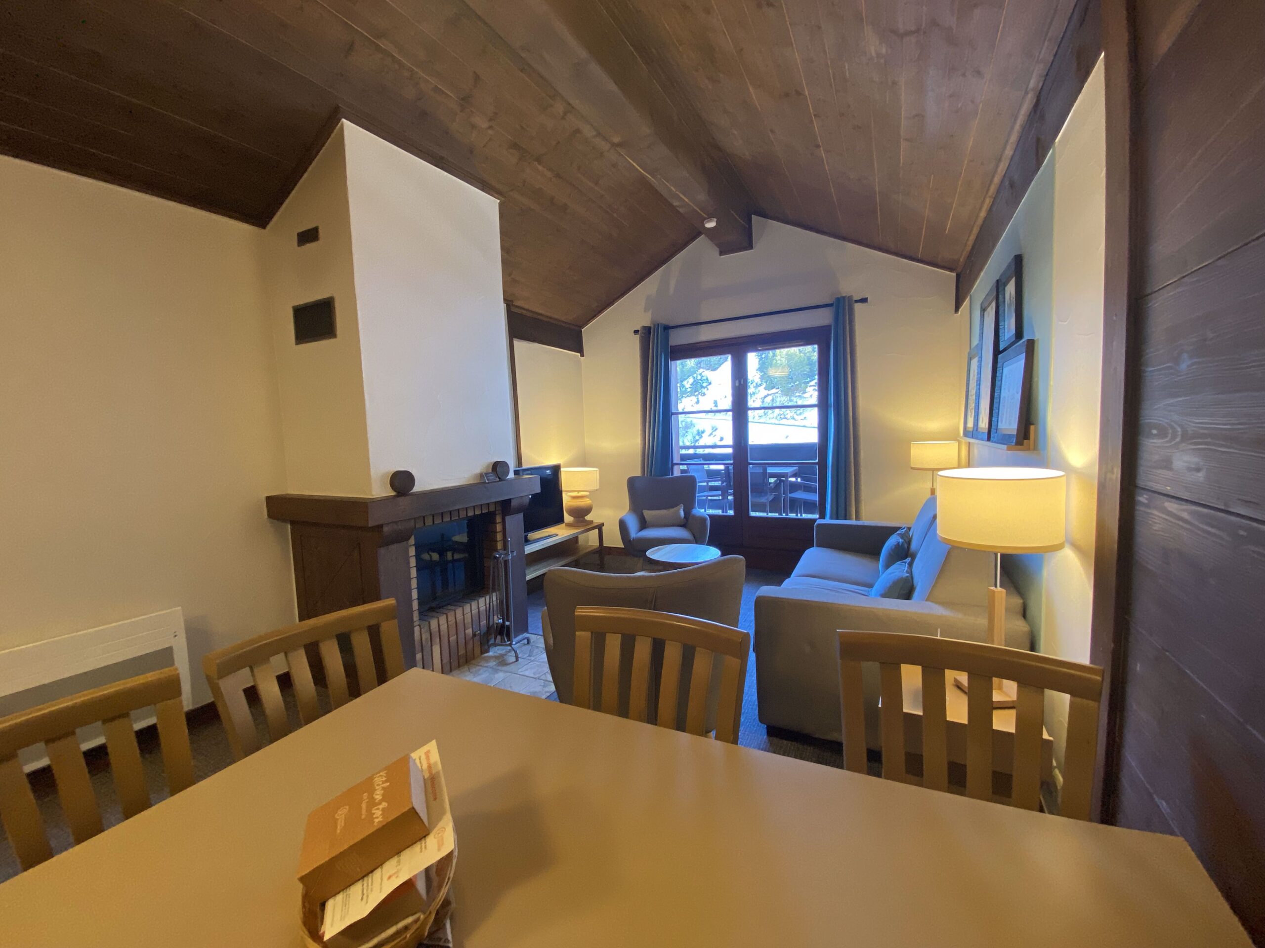 Lovely apartment for Sale in Arc 1950 - Manoir SavoieCosy 2 bed apartment on the top floor. It has a large living room with a fireplace, a north-east terrace with a magnificent view, a kitchen opening onto the living room, 1 bedroom with a double bed and a study area, a bedroom with bunk beds, a bathroom and a separate toilet.