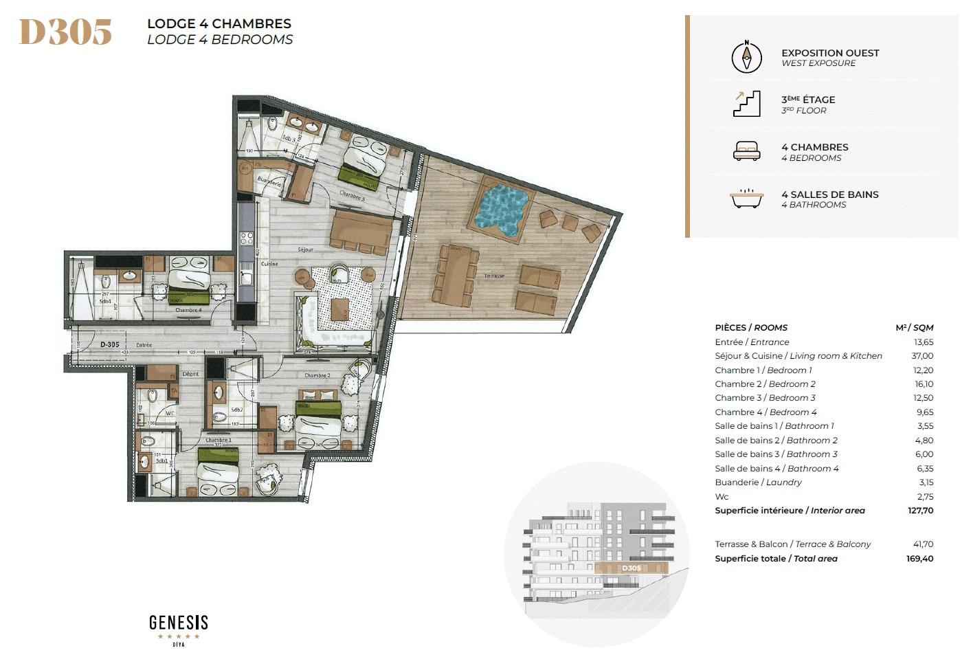 Discover Genesis Diya:At the core of the Genesis project lies the Genesis Diya residence, strategically located just below the ski slopes. This property harmonises with the modern architectural style of Tignes, incorporating natural elements like wood and local stone that beautifully offset its crisp white façades. Choose from a range of apartments—from a 1-bedroom plus cabin option to a spacious 5-bedroom plus cabin unit—offering generous living spaces between 53 and 146 m². The residence also features a wellness centre complete with a swimming pool and fitness room, heated ski lockers/boot room with direct slope access, storage cellars and a private underground parking area.