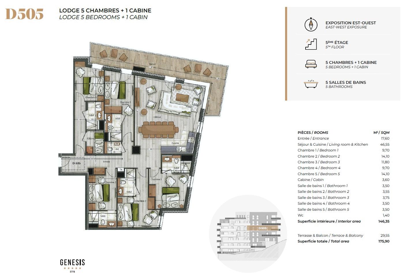 Discover Genesis Diya:At the core of the Genesis project lies the Genesis Diya residence, strategically located just below the ski slopes. This property harmonises with the modern architectural style of Tignes, incorporating natural elements like wood and local stone that beautifully offset its crisp white façades. Choose from a range of apartments—from a 1-bedroom plus cabin option to a spacious 5-bedroom plus cabin unit—offering generous living spaces between 53 and 146 m². The residence also features a wellness centre complete with a swimming pool and fitness room, heated ski lockers/boot room with direct slope access, storage cellars and a private underground parking area.